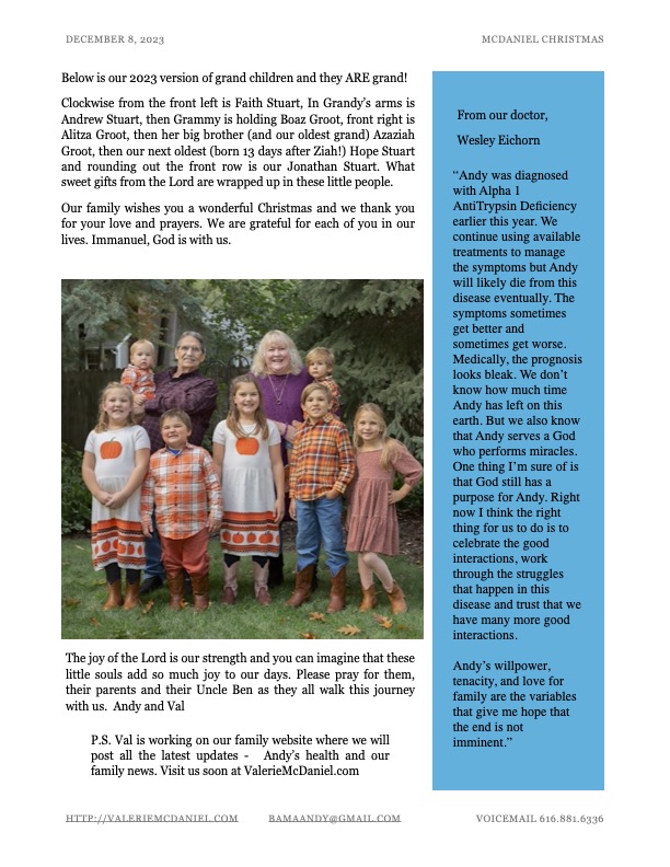 We are the McDaniels (pictured below) Andy and Valerie, son Benjamin with a couple Boersmas (Ben and Cleo – Val’s folks), Stuarts (daughter Elizabeth and her husband Tom) and Groots (daughter Sarah Grace and her husband Cole) in the mix! The beautiful pic was taken in 2013 when we celebrated our (Andy’s and Valerie’s) 30th wedding anniversary.
